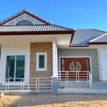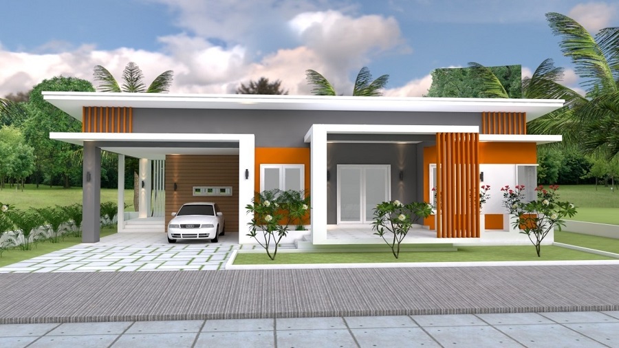 แบบบ้านหลังนี้เป็นแบบบ้านขนาดชั้นเดียว ตัวบ้านออกแบบหน้ากว้างในสไตล์โมเดิร์นที่เรียบง่ายแบบเรขาคณิต ด้านการตกแต่งนั้น ผนังภายนอกตกแต่งด้วยโทนสีเทายืนพื้น แซมด้วยสีขาวและสีส้มที่เข้ากันได้เป็นอย่างดี