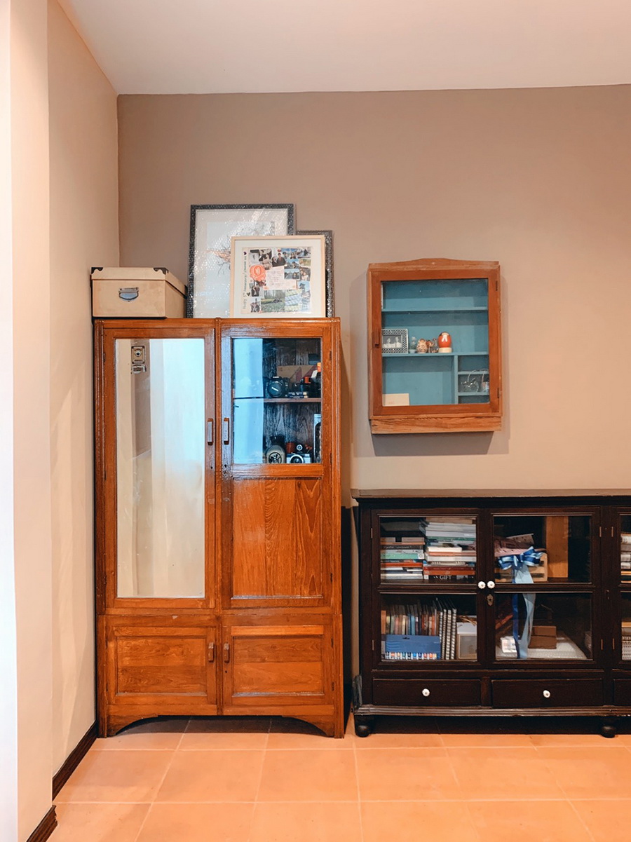 เฟอร์นิเจอไม้ส่วนใหญ่เป็นของเก่า ซึ่งก็พยายามผสมให้เข้าบ้าน มีแค่เตียงจาก ที่ซื้อใหมค่ะ https://www.facebook.com/sosignatureonce/ และ console วางทีวีในห้องนอน