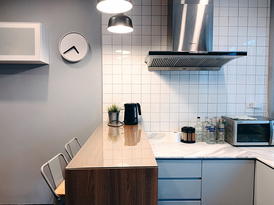 ห้องครัว เราย้ายออกมาทำครัวเล็กๆ ด้านหลังบ้านแทน ใช้เคาน์เตอร์เป็นจุดทานข้าว