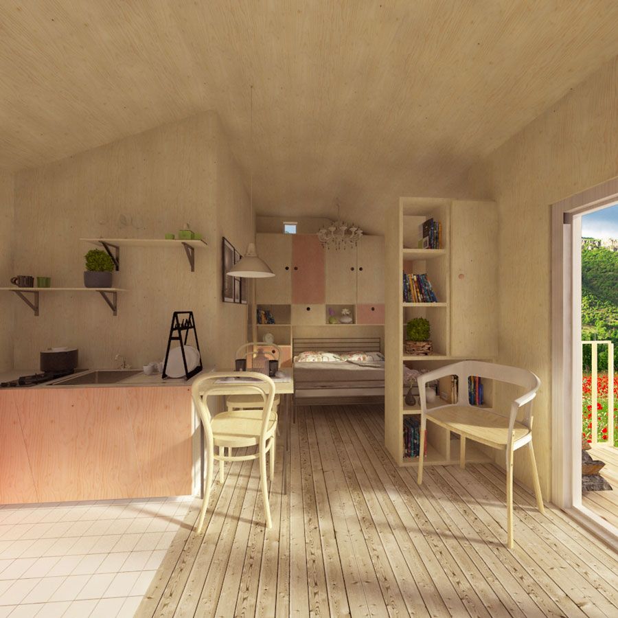 ด้านในมีการออกแบบแบบ Open Plan ไร้ผนังกั้น ให้ความรู้สึกเชื่อมต่อกันทุกส่วน พื้นด้านในปูด้วยไม้ ให้ความอบอุ่นเป็นธรรมชาติ เฟอร์นิเจอร์ด้านในเป็นแบบบิวท์อิน ช่วยประหยัดพื้นที่ทำให้มีสเปซสำหรับการเคลื่อนไหวมากขึ้น