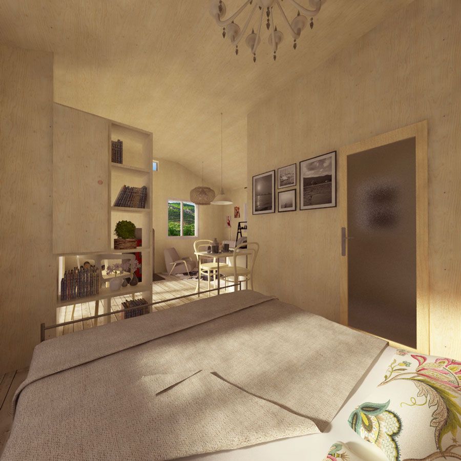 ส่วนห้องนอนมีขนาดกะทัดรัด ตกแต่งเรียบง่าย เหมาะสำหรับคู่รักหรือคนโสด โดดเด่นด้วยตู้เก็บของบริเวณหัวเตียงที่มีช่องเก็บของมากมาย ด้านบนติดโคมไฟระย้า ให้บรรยากาศดูโรแมนติกมากขึ้น