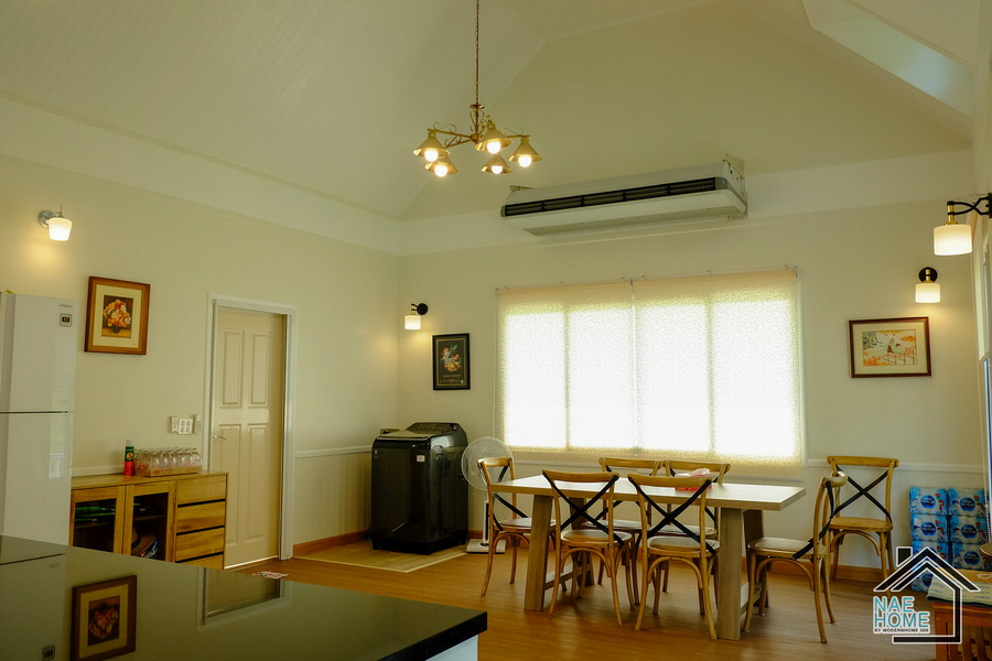 พื้นที่มุมนี้เป็นพื้นที่สำหรับการรับประทานอาหาร กลางห้องตกแต่งด้วยโต๊ะรับประทานอาหารขนาดใหญ่ ใกล้กันจะมีเคาน์เตอร์บาร์และตู้เย็นไว้คยอำนวยความสะดวก