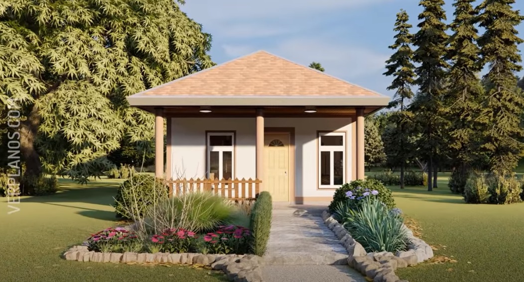 ด้านหน้าจะมีพื้นที่เฉลียงขนาดเล็กไว้ ช่วยเพิ่มความรู้สึกที่ดูเป็นกันเองมากขึ้น ส่วนหลังคาปั้นหยาก็ช่วยเพิ่มความโดดเด่นให้กับตัวบ้านได้เป็นอย่างดี นอกจากนั้นแล้วยังเข้ากับรูปทรงของบ้านอีกด้วยค่ะ