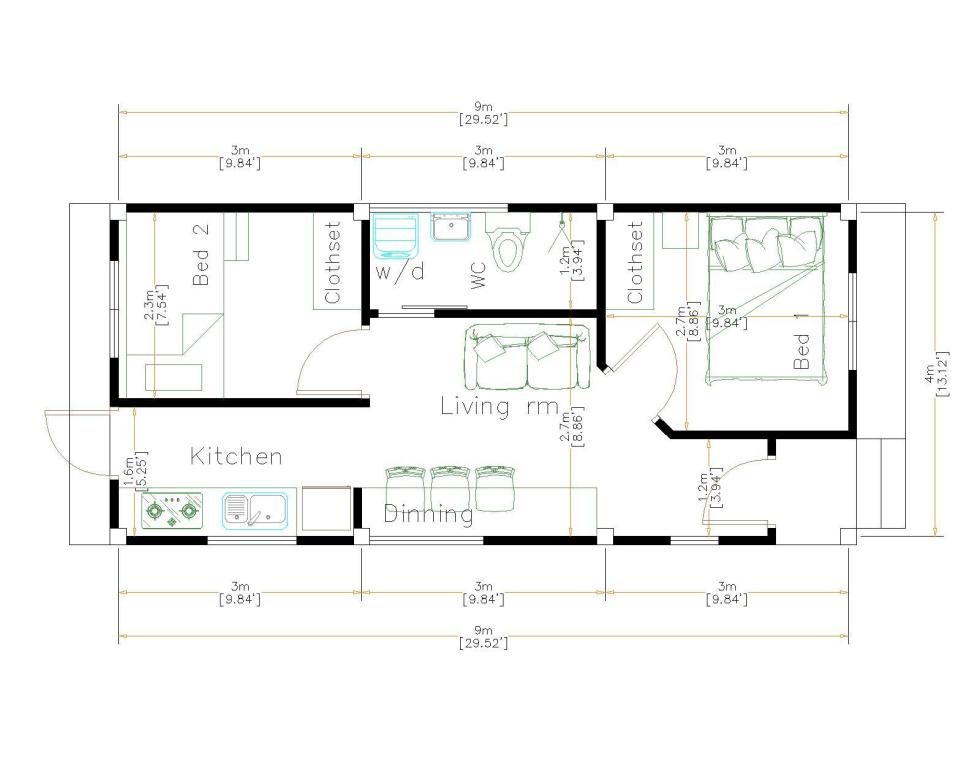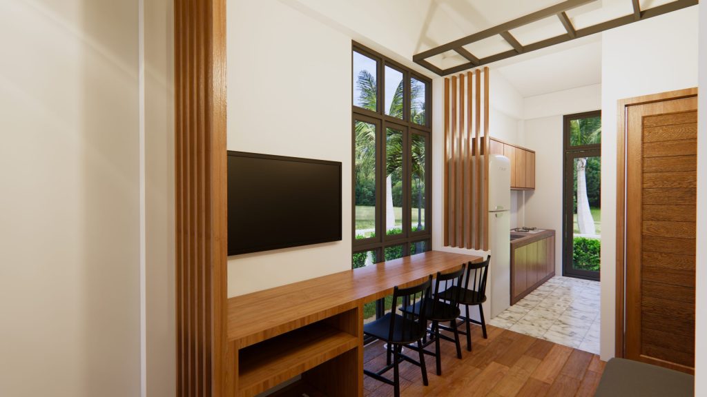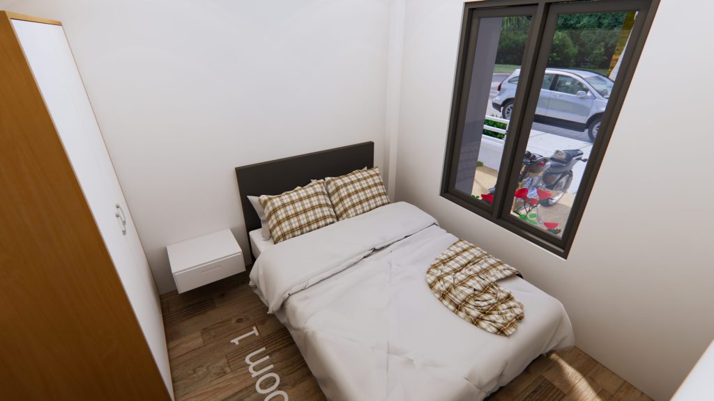 แบบบ้านหลังนี้ประกอบไปด้วย 2 ห้องนอน 1 ห้องน้ำ ห้องโถงที่รวมห้องนั่งเล่น ห้องทานข้าว และห้องครัวไว้ด้วยกัน บนพื้นที่ใช้สอยสุดกะทัดรัดเพียง 36 ตารางเมตร เหมาะสำหรับที่ดินหน้าแคบหลังลึก (กว้างอย่างน้อย 4 เมตร ยาวอย่างน้อย 9 เมตร)