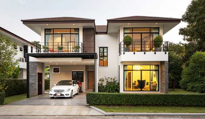 ลักษณะบ้านสองชั้น หลังคาทรงปั้นหยา ผนังภายนอกเลือกใช้โทนสีขาวเรียบๆ แทรกไปด้วยองค์ประกอบการตกแต่งจากงานเหล็กจากซุ้มที่จอดรถใต้ชายคา และวงกบหน้าต่าง/ประตู มีการแบ่งส่วนบ้านออกเป็นสองปีก
