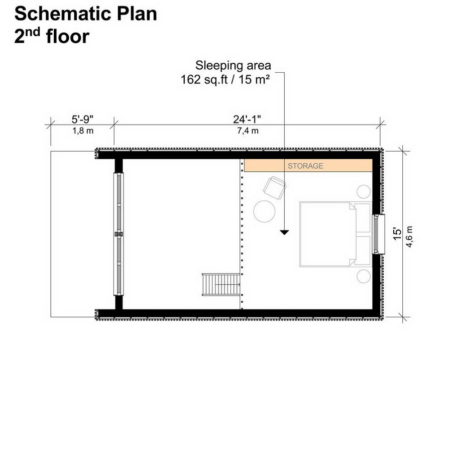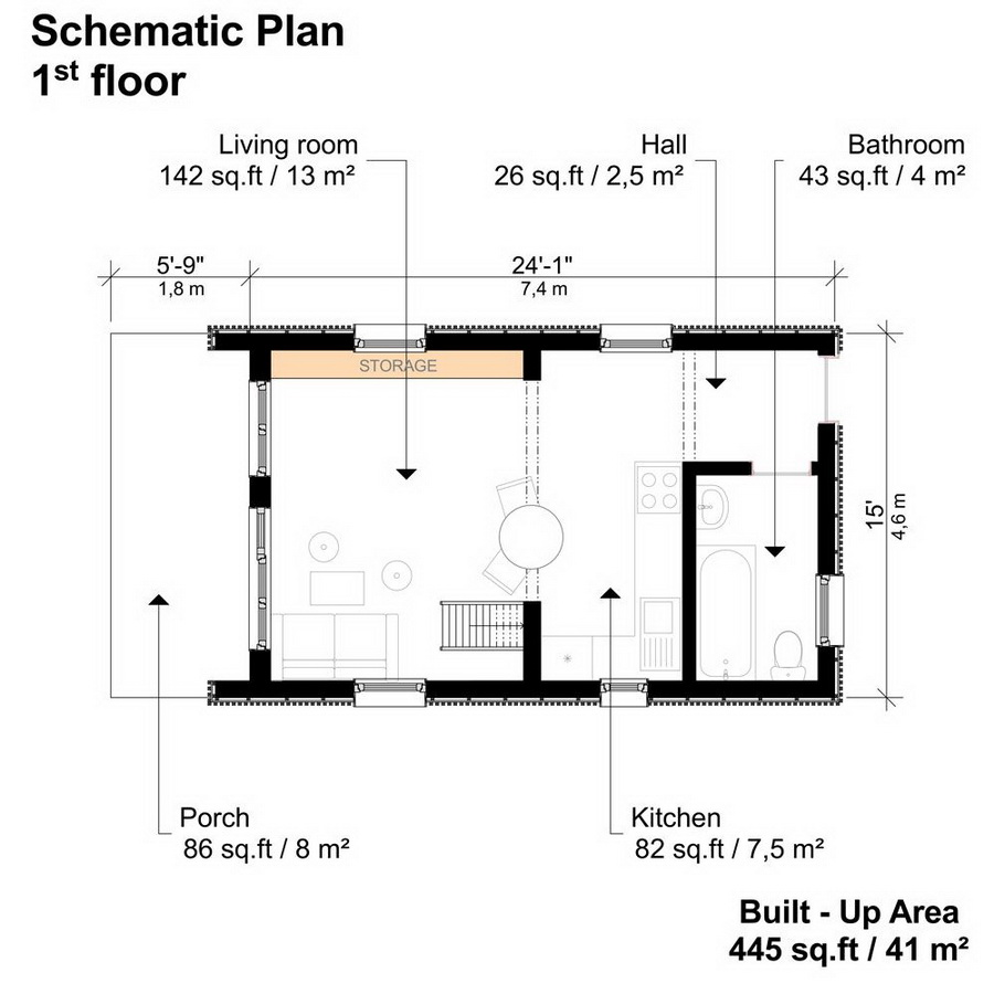 แบบบ้านไม้ทรงจั่วสองชั้นหลังนี้ประกอบไปด้วย 1 ห้องนอน 1 ห้องน้ำ 1 ห้องโถงนั่งเล่น 1 ห้องครัว พร้อมเฉลียงหน้าบ้าน พื้นที่ใช้สอย 41 ตารางเมตร