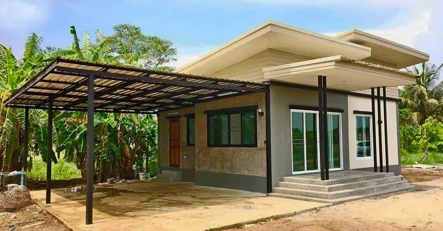 บ้านหลังนี้เป็นผลงานการออกแบบจาก รับสร้างบ้าน ราคาประหยัด By SK Home มีขนาดกะทัดรัด แต่ฟังก์ชันครบครัน โดยการตกแต่งภายนอกจะเน้นผนังปูนเปลือยเป็นหลัก และมีการโชว์โครงสร้างเสาเหล็กสีดำ ตัดกับผนังสีขาวบางจุด ส่วนหลังคาบ้านเป็นแบบเพิงหมาแหงนเล่นระดับ ช่วยเสริมความโดดเด่นให้กับตัวบ้านมากขึ้น