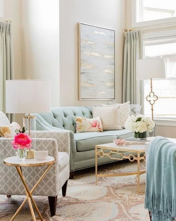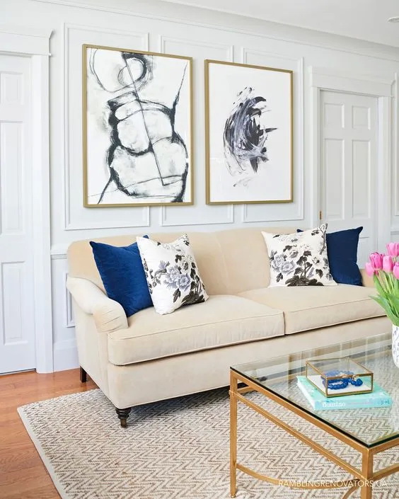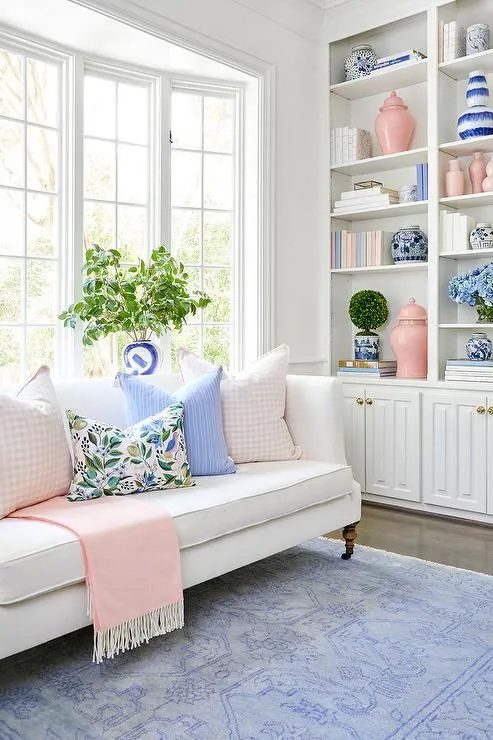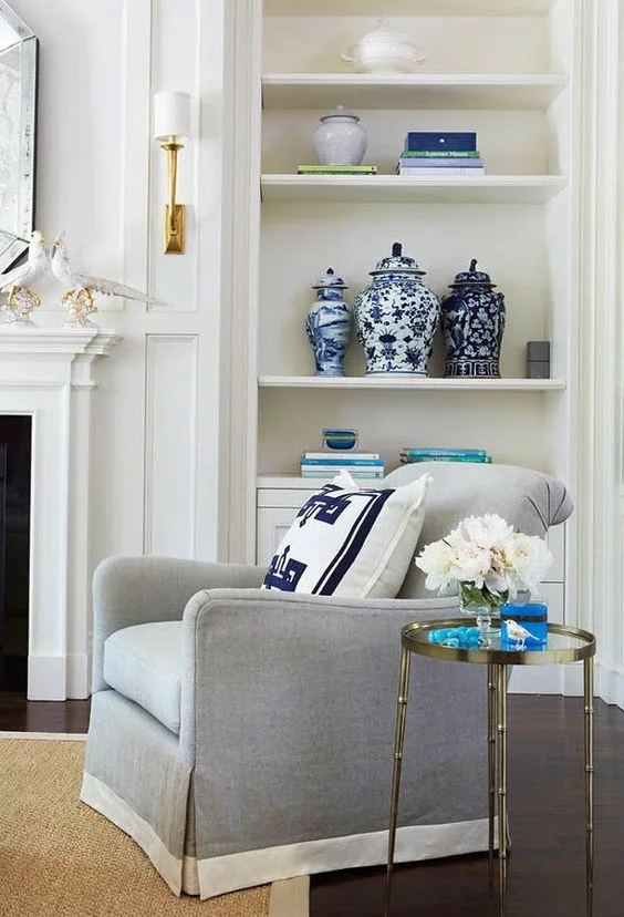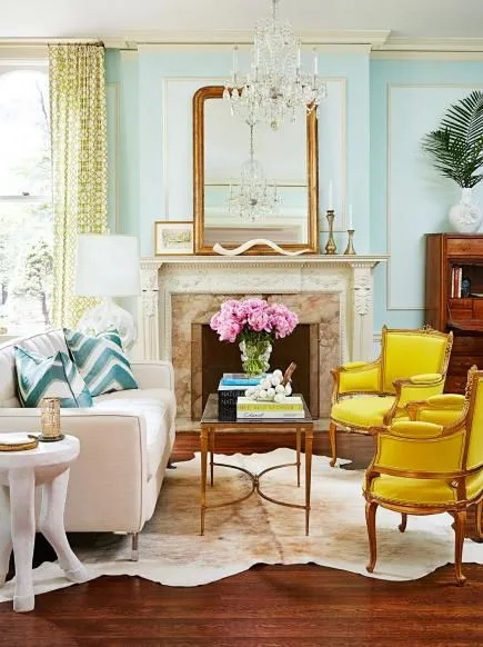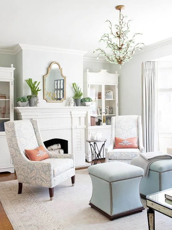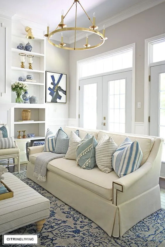 สีฟ้าและสีขาว เป็นคู่สีที่มีมาตั้งแต่โบราณ และยังคงเป็นคู่สีที่ยังคงเข้ากันได้เป้นอย่างดี จึงสามารถเลือกเฟอร์นิเจอร์ หรือของตกแต่งด้วยคู่สีนี้มาตกแต่งภายในห้องนั่งเล่นได้