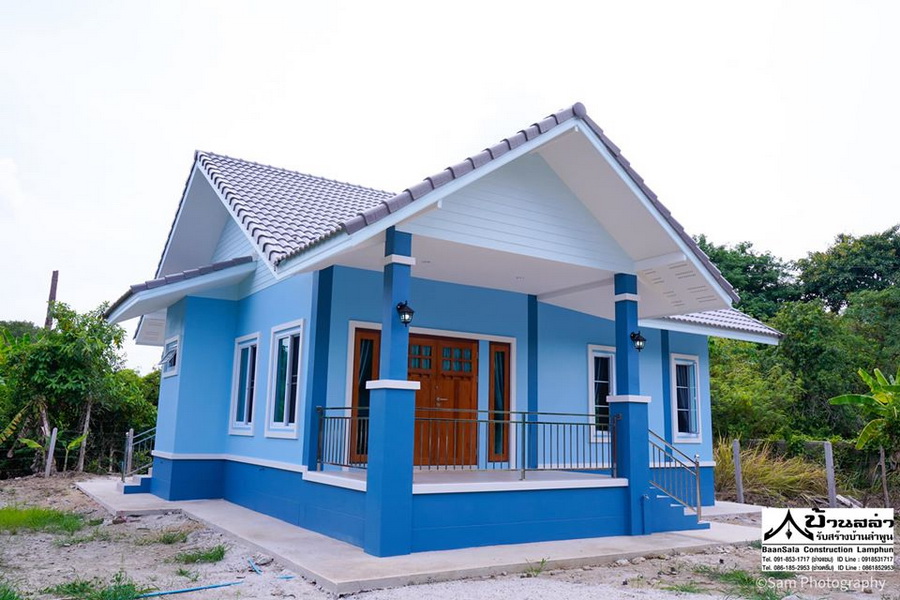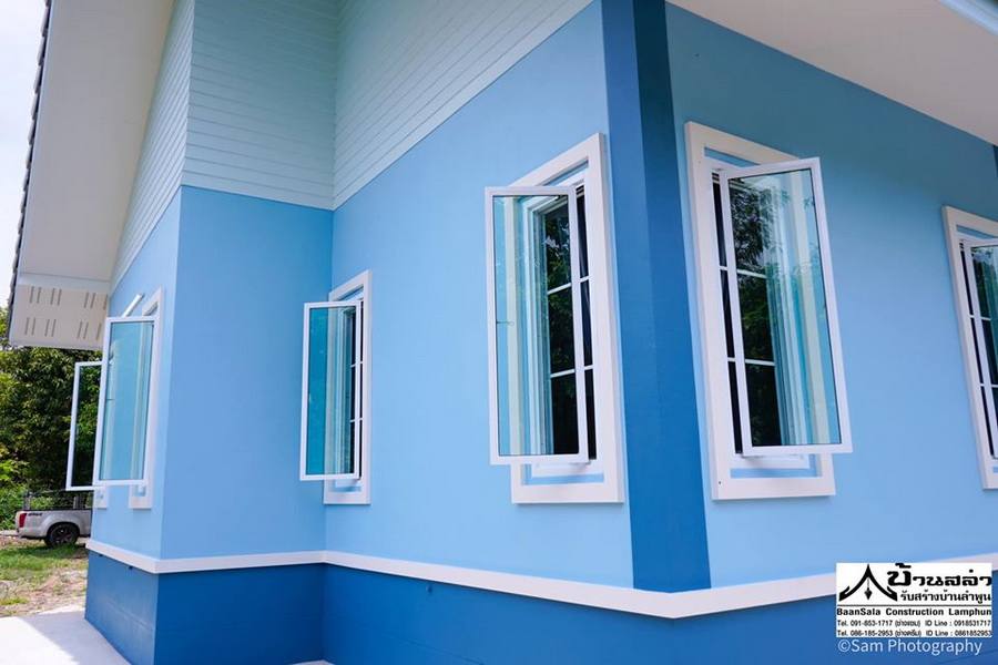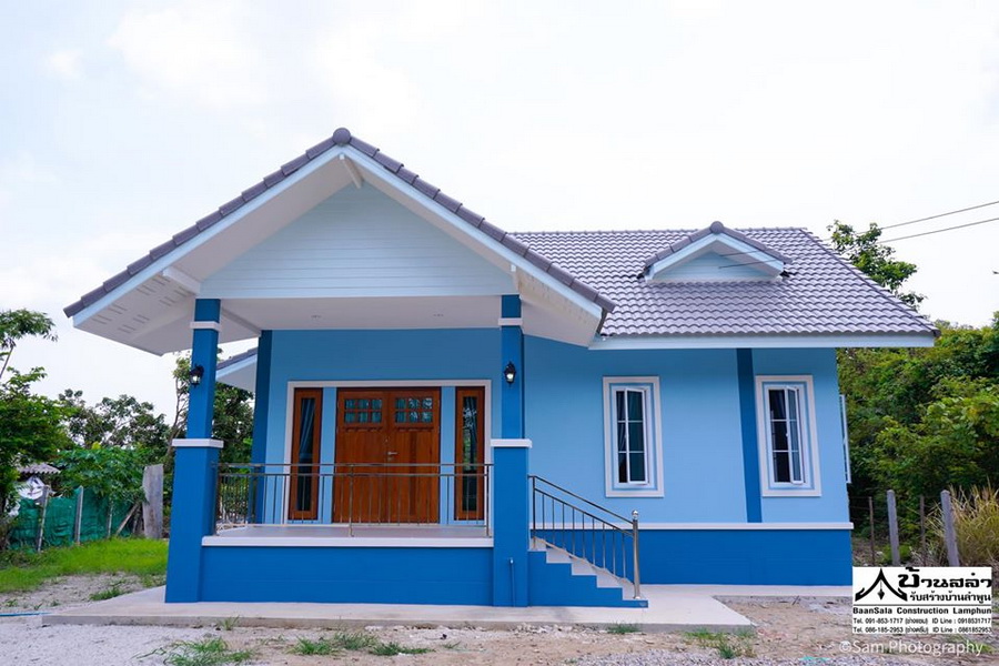 ลักษณะบ้านชั้นเดียว ฐานของบ้านถูกยกขึ้นสูง ตัวบ้านออกแบบด้วยรูปทรงแบบคอนเทมโพรารีที่เราคุ้นตากันดี ความโดดเด่นของบ้านหลังนี้อยู่ที่การออกแบบหลังคาทรงหน้าจั่งที่มุงด้วยกระเบื้องลอนสีเข้ม พร้อมกับการตกแต่งตัวบ้านด้วยโทนสีฟ้าสดใสทั่วทั้งหลัง
