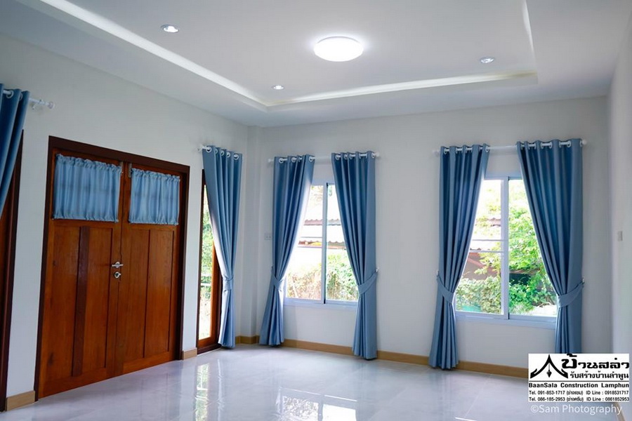 เมื่อเข้ามาภายในบ้าน เราจะพบกับห้องโถงขนาดใหญ่ของบ้าน ซึ่งภายในตกแต่งด้วยโทนสีขาวสว่าง เพิ่มความสวยงามด้วยผ้าม่านสีฟ้าและเพดานแบบหลุมพร้อมไฟเพดานสวยงาม