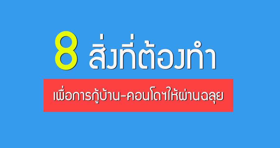วันนี้ ในบ้าน จะมาบอกเคล็ดลับดี ๆ ด้วย 8 สิ่งที่ต้องทำเพื่อการกู้สินเชื่อบ้าน-คอนโดฯ ให้ผ่านฉลุย ข้อมูลง่าย ๆ ที่จะเป็นตัวช่วยให้กับเพื่อน ๆ ที่กำลังวางแผนในการกู้สินเชื่อเพื่อบ้าน จะได้มีแนวทางในการเตรียมตัวให้การกู้ผ่านได้ได้อย่างฉลุย โดยเทคนิคในการขอกู้ให้ผ่าน มีดังนี้