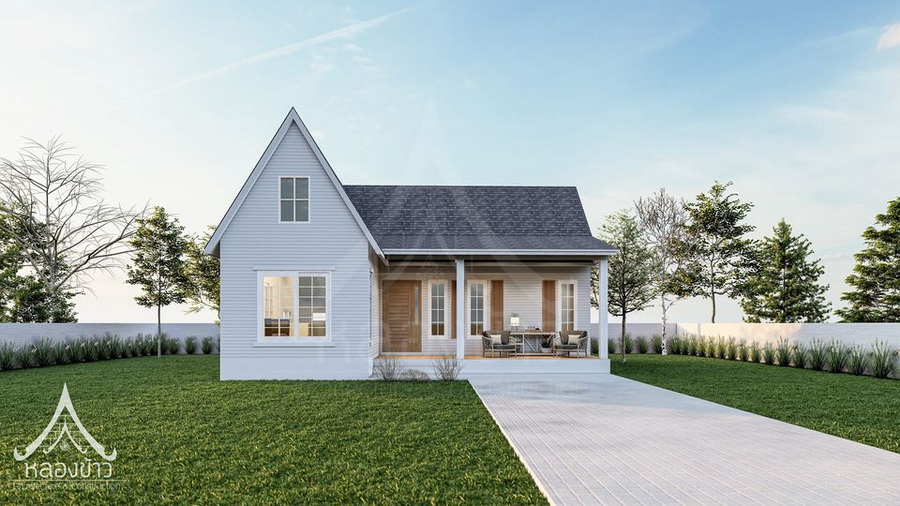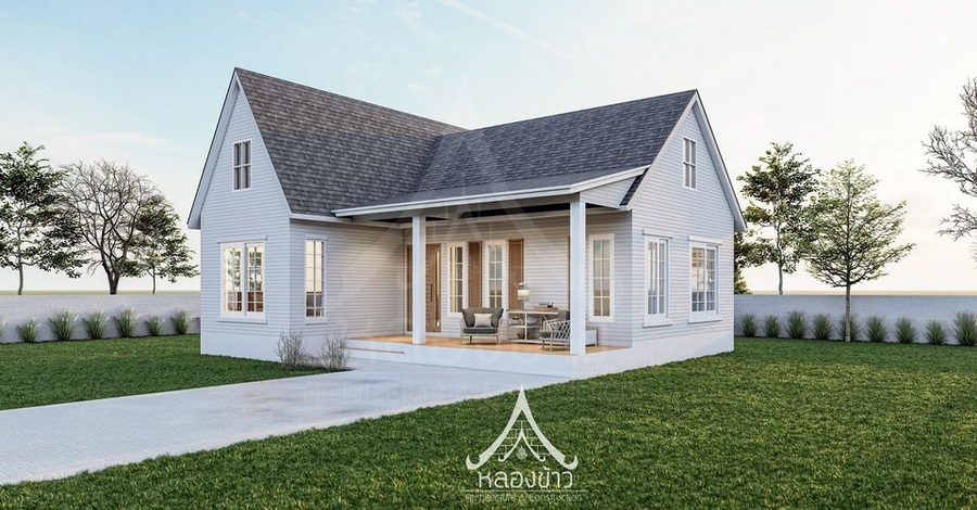 แบบบ้านสไตล์คอทเทจหลังนี้ประกอบไปด้วย 2 ห้องนอน 2 ห้องน้ำ 1 ห้องโถงนั่งเล่น 1 ห้องครัว พร้อมเฉลียงหน้าบ้านแบบเปิดโล่ง พื้นที่ใช้สอย 80 ตารางเมตร