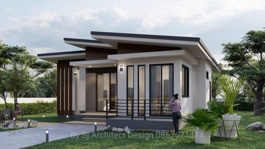 แบบบ้านหลังนี้เป็นบ้านขนาดชั้นเดียว ฐานของบ้านถูกยกขึ้นต่ำ ตัวบ้านออกแบบด้วยดีไซน์แบบโมเดิร์นในทรงสี่เหลี่ยม ความโดดเด่นของบ้านอยู่ที่การออกแบบหลังคาทรงสโลปที่ผสานกับหลังคาแบบเรียบ เป็นรูปทรงที่สวยงามเข้ากับบ้านสุด ๆ