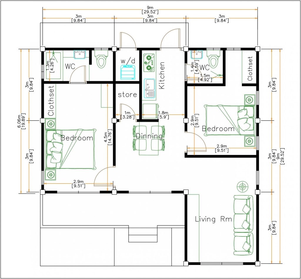 แบบบ้านฉบับนี้ประกอบไปด้วย 2 ห้องนอน 1 ห้องน้ำ ห้องนั่งเล่น ห้องทานข้าว ห้องคีรัว ห้องซักล้าง และห้องเก็บของ บนพื้นที่ใช้สอยเพียง 35 ตารางเมตรครับ