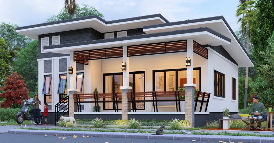 แบบบ้านหลังนี้เป็นบ้านขนาดชั้นเดียว ตัวบ้านมีดีไซน์เรียบง่ายในทรงสี่เหลี่ยมแบบโมเดิร์น หลังคาแบบเรียบที่ออกแบบเล่นระดับสวยงาม ผนังภายนอกของบ้านตกแต่งด้วยโทนสีขาวสลับกับสีเทา จึงให้บรรยากาศที่ดูสบายตา