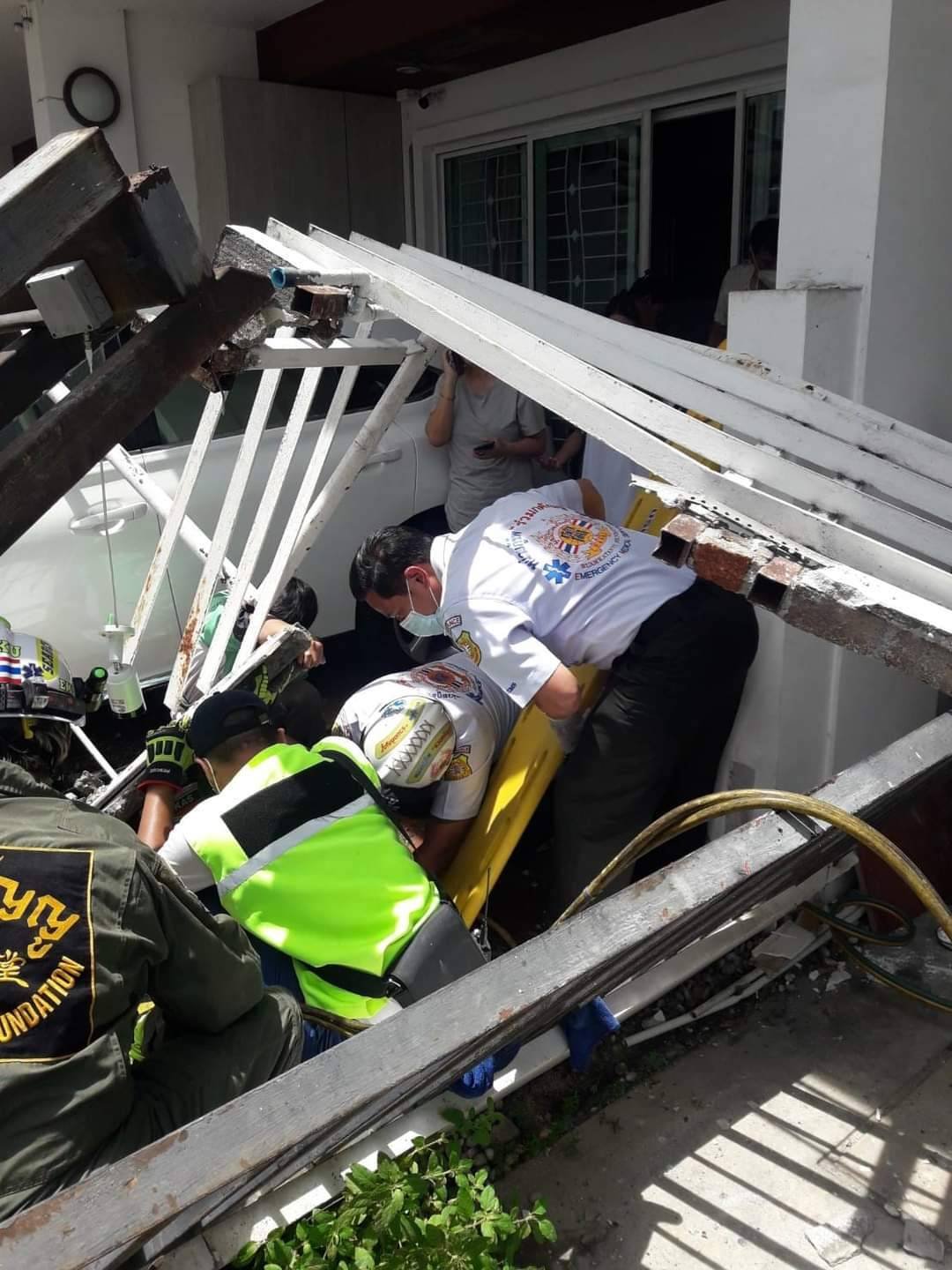 ขณะที่ลูกสาวและเพื่อนที่ได้รับบาดเจ็บกำลังจะเดินออกจากบ้าน จู่ๆ ระเบียงชั้น 2 ที่ต่อเติมออกมาเป็นหลังคาโรงรถและที่ตากผ้าได้พังถล่มลงมาทับจนได้รับบาดเจ็บ