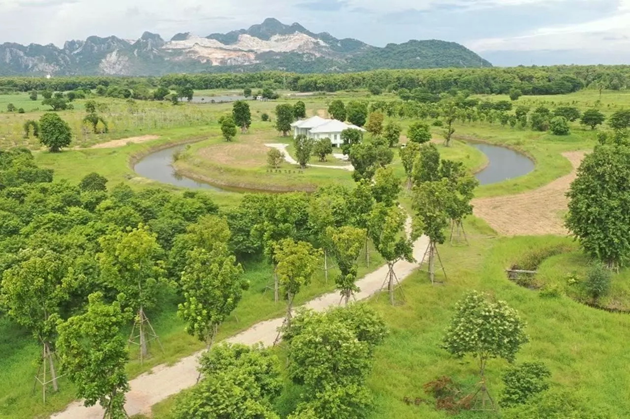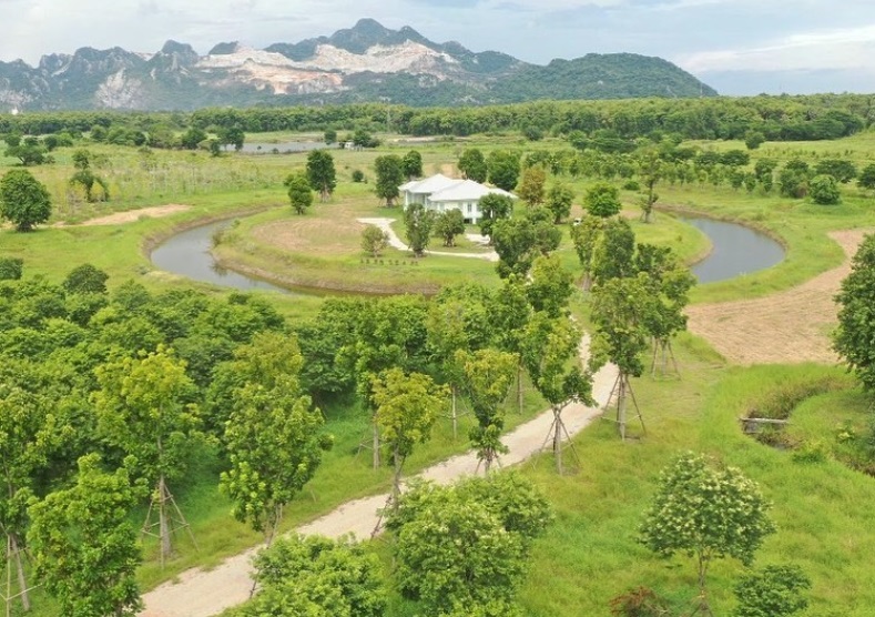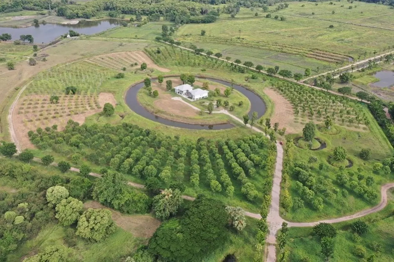 บรรยากาศจากมุมสูง จะเห็นบ้านพักตากอากาศที่ล้อมด้วยคูน้ำ ในขณะที่ชั้นนอกก็จะเป็นต้นไม้หลากหลายชนิดที่ได้ปลูกเอาไว้ในไร่