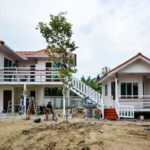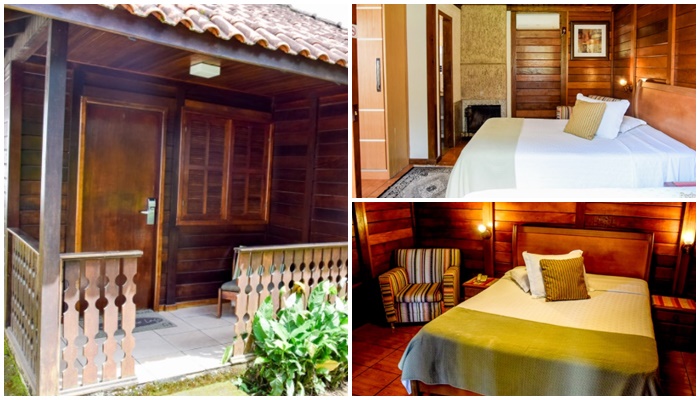 บ้านพักตากอากาศชั้นเดียว ดีไซน์คลาสสิค โครงสร้างทั้งหลังใช้ไม้เป็นวัสดุหลัก ด้านหน้ามีระเบียงขนาดเล็ก พร้อมเก้าอี้ไว้สำหรับนั่งรับ สูดกลิ่นธรรมชาติตลอดวัน