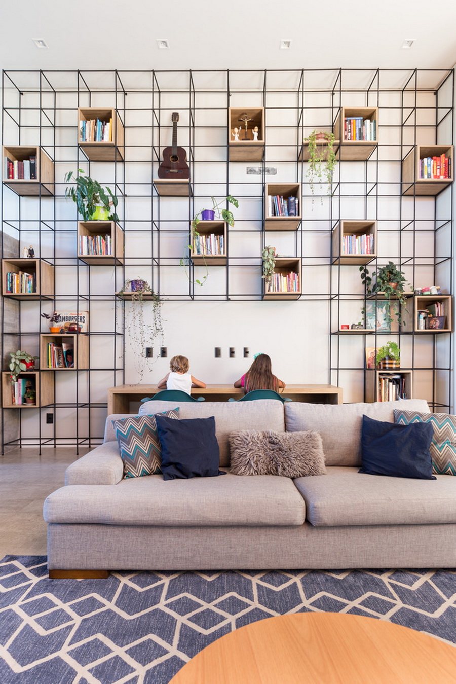 ด้านหลังห้องนั่งเล่นตกแต่งให้เป็นมุมเรียนรู้ของเด็กๆ โดยจะมีชั้นหนังสือดีไซน์มีเอกลักษณ์ และโต๊ะทำการบ้านที่เหมาะกับเด็กๆ