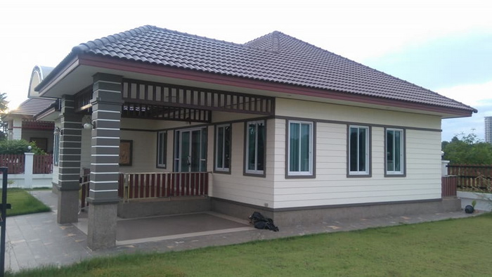 ลักษณะบ้านชั้นเดียว หลังคาทรงปั้นหยามุงด้วยกระเบื้องลอน ผนังภายนอกตกแต่งด้วยไม้ฝาสีขาว บรรยากาศรอบๆ บ้านรายล้อมไปด้วยสนามหญ้าสีเขียว เติมเต็มความสดชื่นให้กับภาพรวมของบ้านหลังนี้ได้เป็นอย่างดี