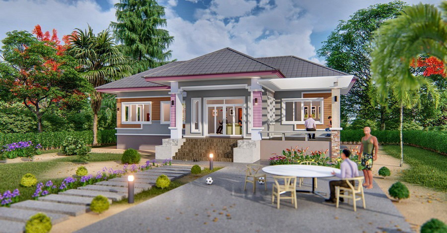 บ้านหลังนี้เป็นบ้านขนาดชั้นเดียว ออกแบบด้วยสไตล์คอนเทมโพรารี ตัวบ้านยกพื้นขึ้นสูง ผนังภายนอกตกแต่งด้วยโทนสีอ่อน โดยผสานหลากสีสัน ไม่ว่าจะเป็นสีเทา สีขาว สีชมพู ช่วยให้บ้านดูมีเอกลักษณ์ที่โดดเด่น ในส่วนของหลังคาเป็นหลังคารูปทรงปั้นหยา มุงด้วยกระเบื้องแบบเรียบโทนสีเทา