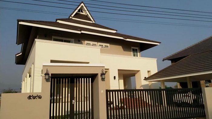 ลักษณะบ้านสไตล์คอนเทมโพรารี่ขนาดสองชั้น พร้อมโรงจอดรถ ผนังภายนอกตกแต่งด้วยโทนสีอ่อนอย่างสีขาว และสีครีม หลังคาของบ้านหลังนี้เป็นเอกลักษณ์ที่น่าดึงดูด และมีเสน่ห์ โดยเป็นหลังคาที่ออกแบบด้วยรูปทรงหน้าจั่ว แบบเล่นระดับ มุงด้วยกระเบื้องแบบเรียบในโทนสีเข้ม