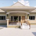 ดีไซน์บ้านชั้นเดียวยกสูงจากพื้นเล็กน้อย โครงสร้างคอรกรีต ภายนอกแต่งแต้มด้วยโทนสีครีมอ่อนแซมด้วยสีน้ำตาล กรุแต่งเพิ่มดีเทลด้วยแผ่นไม้เทียมสีอ่อน หลังคามุงเมทัลชีททรงเพิงหมาหงนเล่นระดับ บริเวณหน้าบ้านมีเฉลียงขนาดย่อมปูพื้นกระเบื้องสีน้ำตาล พร้อมก่อม้านั่งปูนไว้เป็นมุมพักผ่อนชิลล์ๆ นอกบ้าน