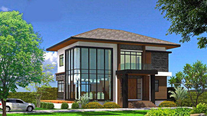 ลักษณะบ้านขนาดสองชั้น ออกแบบด้วยรูปทรงที่เรียบง่ายสไตล์คอนเทมโพรารี่ ผนังภายนออกตกแต่งด้วยโทนสีเข้มอย่างสน้ำตาล และสีเทา แซมด้วยสีขาว เอกลักษณ์และความโดดเด่นของบ้านหลังนี้ คือ ผนังกระจกใสหน้าบ้านที่ออกแบบด้วยรูปทรงสูงกินพื้นที่บ้านทั้งสองชั้น