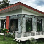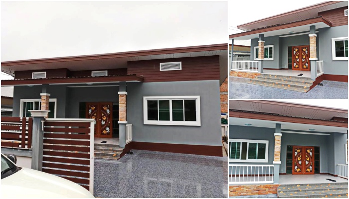 บ้านชั้นเดียวปกคลุมด้วยหลังคาทรงเพิงหมาแหงน พื้นรอบบ้านปูพื้นกระเบื้องลายหินอ่อนสีเทา สามารถจอดรถและเป็นลานใช้งานอเนกประสงค์