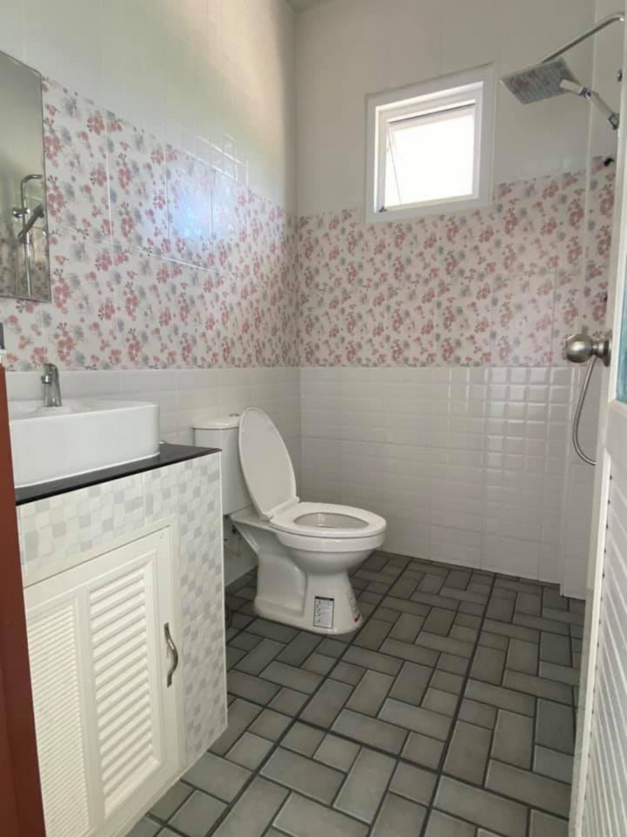 ทางด้านของห้องน้ำ ภายในมีพื้นที่ใช้สอยที่พอประมาณ ผนังห้องตกแต่งด้วยผนังลายดอกไม้ จึงให้บรรยากาศที่ผ่อนคลายน่าใช้งาน