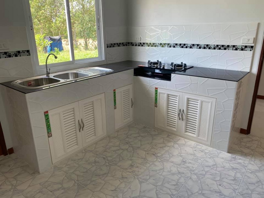 ห้องครัวถูกออกแบบเรียบง่ายในสไต์แบบโมเดิร์น เน้นความโปร่งสบาย จึงสามารถถ่ายเทอากาศได้ดีในช่วงทำอาหาร
