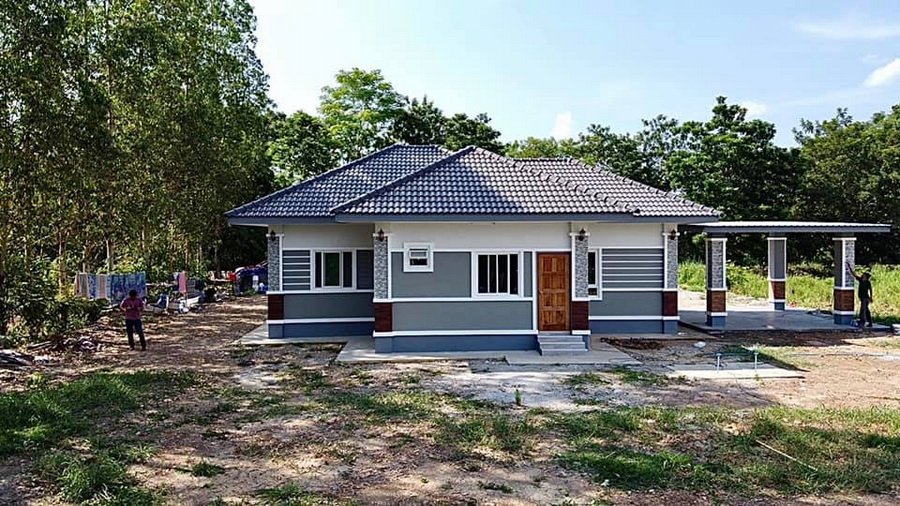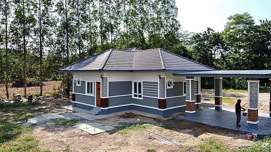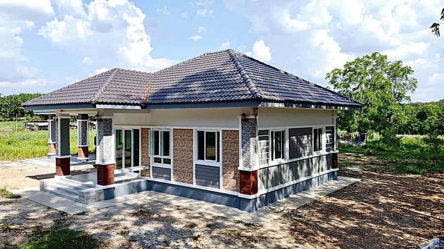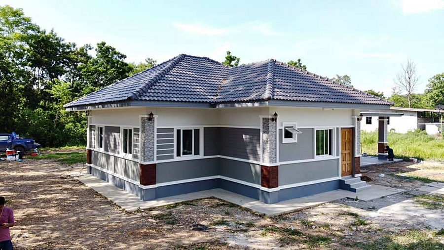 บ้านหลังนี้เป้นบ้านขนาดชั้นเดียว ตัวบ้านออกแบบในดีไซน์คอนเทมโพรารี เน้นรายละเอียดการตกแต่งอย่างสวยงาม หลังคาทรงปั้นหยามุงกระเบื้องลอน ่ผนังภายนอกบ้านเลือกใช้โทนสีครีมสลับกับสีน้ำเงินอมเทา พร้อมเพิ่มดีเทลด้วยอิฐหินทรายลวดลายสวยงาม