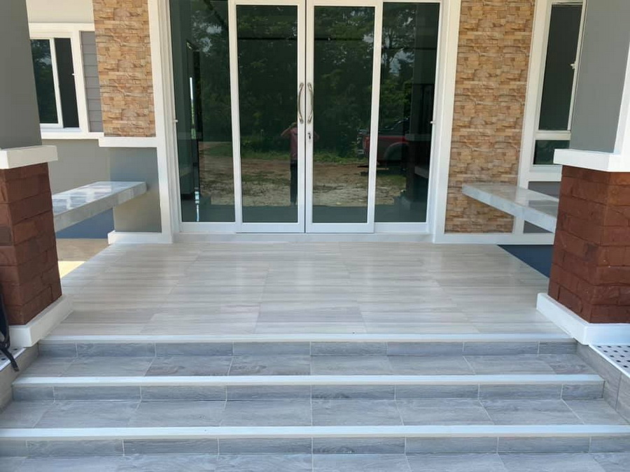 บรืเวณหน้าบ้านออกแบบให้เป็นเฉลียงแบบเปิดโล่ง พร้อมกับม้านั่งสองด้าน จึงเป็นมุมรับแขกและมุมพักผ่อนได้เป็นอย่างดี