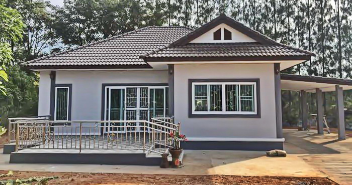บ้านชั้นเดียวรูปทรงร่วมสมัยหลังนี้ประกอบไปด้วย 2 ห้องนอน 2 ห้องน้ำ 1 ห้องครัว 1ห้องโถง ระเบียงหน้าบ้าน พร้อมต่อเติมโรงรถเพิ่มเข้ามา งบก่อสร้างอยู่ที่ 1 ล้านบาท