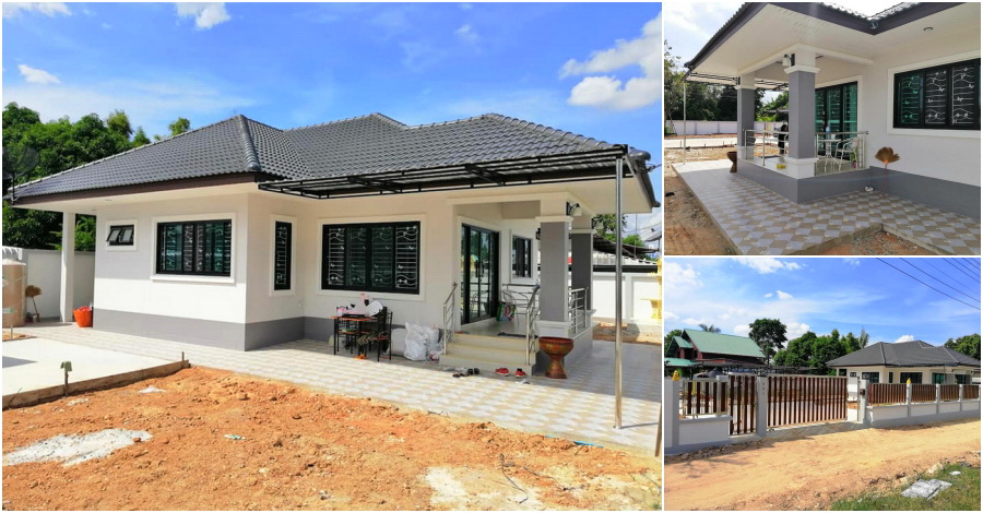 สำหรับบ้านหลังนี้เป็นบ้านชั้นเดียวออกแบบด้วยรูปทรงร่วมสมัย การตกแต่งภายนอกนั้นตัวผนังเลือกใช้โทนสีขาวยืนพื้น แซมด้วยสีเทาในส่วนฐาน เพื่อช่วยป้องกันคราบสกปรก หลังคาของบ้านเป็นหลังคารูปทรงปั้นหยาที่มุงด้วยกระเบื้องลอนสีเทา
