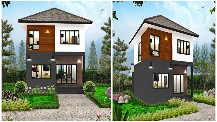 ลักษณะบ้านขนาดสองชั้น ออกแบบด้วยสไตล์คอนเทมโพรารี่ หลังคาเลือกใช้หลังคารูปทรงปั้นหยามุงด้วยกระเบื้องแบบแบน ผนังภายนอกออกแบบและตกแต่งอย่างหลากหลายและสวยงามมีเอกลักษณ์ โดยผนังชั้นล่างตกแต่งด้วยโทนสีเข้มอย่างสีเทาและสีน้ำตาลที่เพิ่มดีเทลด้วยผนังอิฐ
