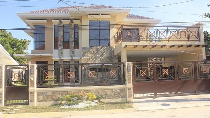 ลักษณะบ้านขนาดสองชั้น หลังคารูปทรงปั้นหยามุงด้วยกระเบื้องลอน ภายนอกตกแต่งด้วยโทนสีน้ำตาลและสีครีมที่ให้ความรู้สึกอบอุ่น นอกจากตัวบ้านแล้ว เจ้าของบ้านยังใส่ใจกับรายละเอียดของรั้วบ้าน โดยเลือกตกแต่งด้วยรั้วลวดลายสี่เหลี่ยมสีดำที่มีลูกเล่นเป็นกรอบซ้อนชั้นกันสวยงาม