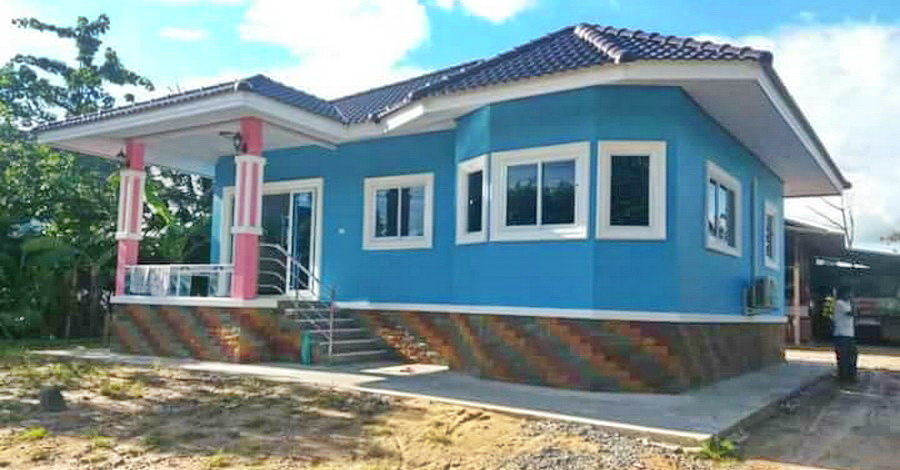 การตกแต่งภายนอกของบ้านหลังนี้เลือกใช้สีฟ้าสดในการตหแต่ง พร้อมกับเพิ่มดีเทลจากสีขาวจากกรอบหน้าต่าง และสีชมพูจากเสาหน้าบ้าน