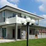 ลักษณะเป็นแบบบ้านสองชั้น ผนังภายนอกด้านล้างใช้สีโทนน้ำตาน อ่อน – เข้ม ด้านบน ใช้สีขาวเรียบๆ หลังคาทรงหน้าจัวเล่นสเต็ปถึงสองชั้น มีที่จอดรถในร่มด้านขวามือ และยังมีพื้นที่สวนสนามหญ้าสีเขียวเพิ่มความสดชื่นได้ไม่น้อย