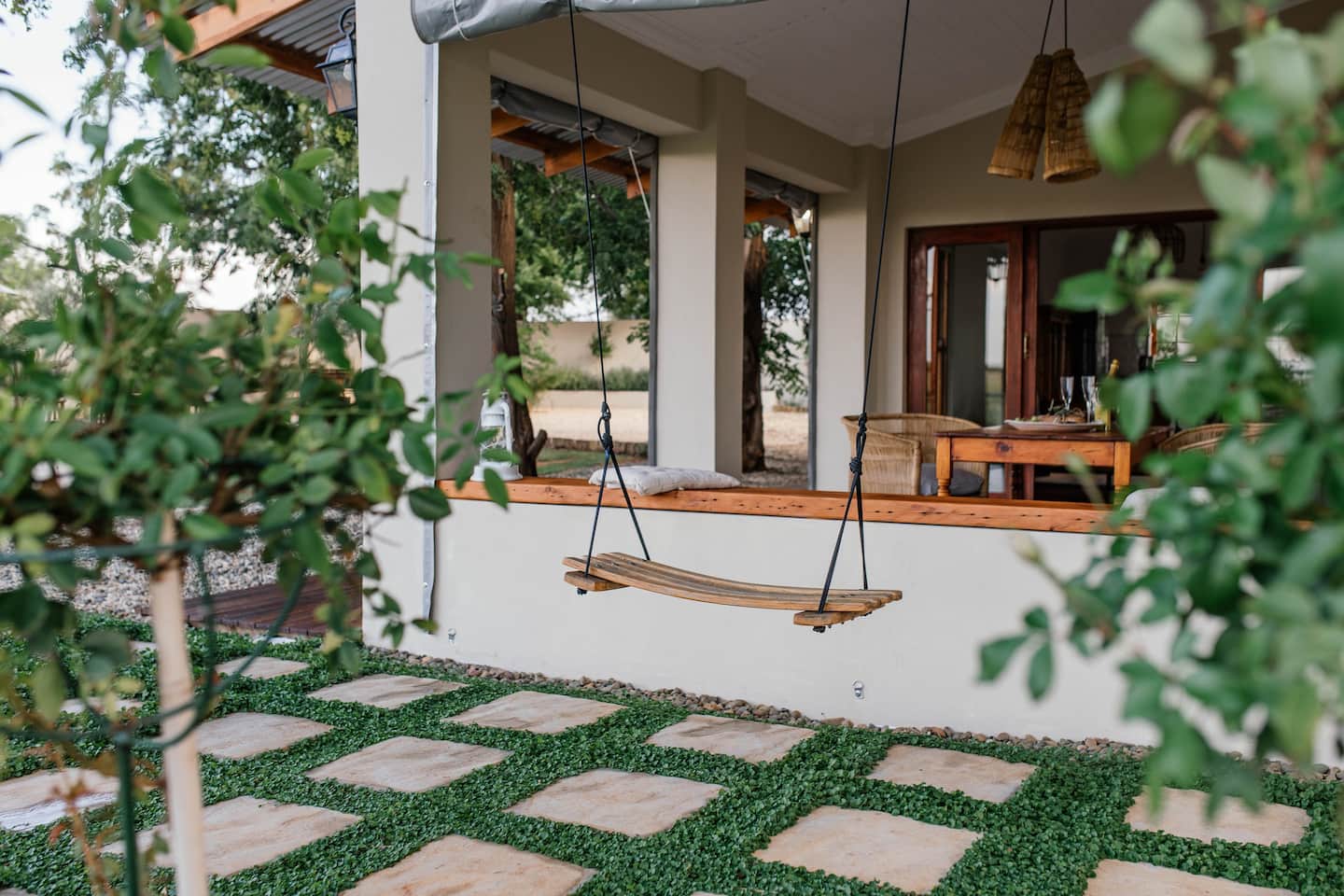 ถัดออกมาจากลานหน้าบ้าน ที่ด้านข้างจะมีสนามหญ้าอีกแห่งที่ปูแผ่นหินเอาไว้แบบห่าง ๆ ที่มุมนี้ยังเป็นมุมพักผ่อนอีกแห่งหนึ่งของบ้าน ซึ่งมีชิงช้าห้อยเอาไว้ให้เราได้นั่งเล่น