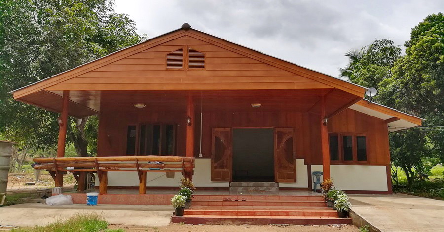 บ้านชั้นเดียวครึ่งไม้ครึ่งปูนสไตล์บ้านชนบทหลังนี้ประกอบไปด้วย 3 ห้องน้ำ 2 ห้องน้ำ 1 ห้องนั่งเล่น และ 1 ห้องครัว งบประมาณ 600,000 บาท
