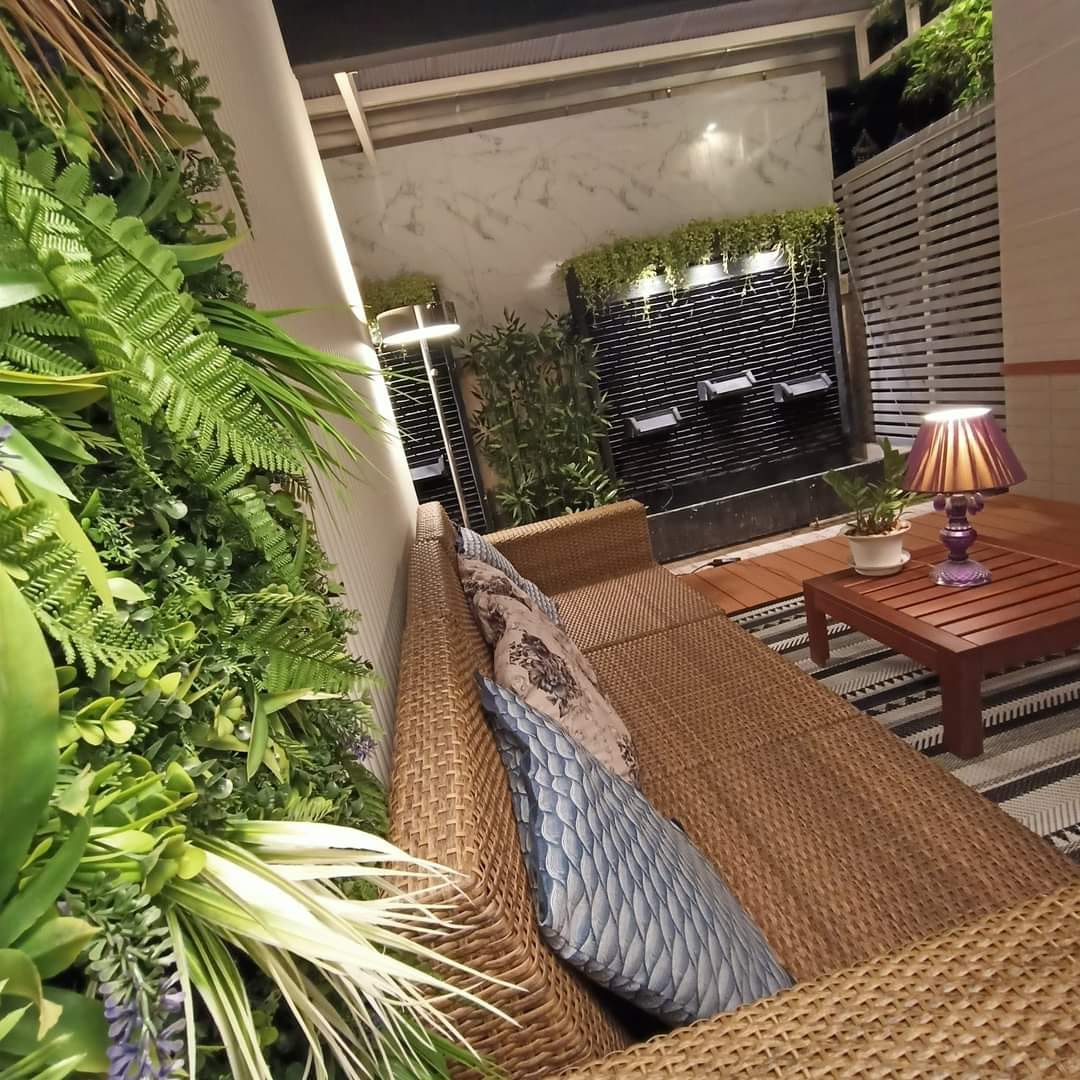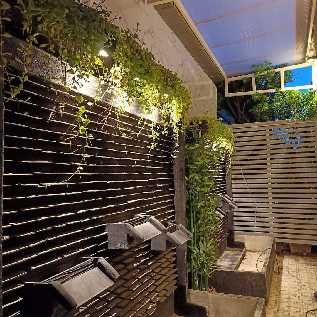 ตรงกำแพงหลังบ้านถูกตกแต่งให้เป็นกำแพงน้ำตก ช่วยสร้างบรรยากาศให้สดชื่น