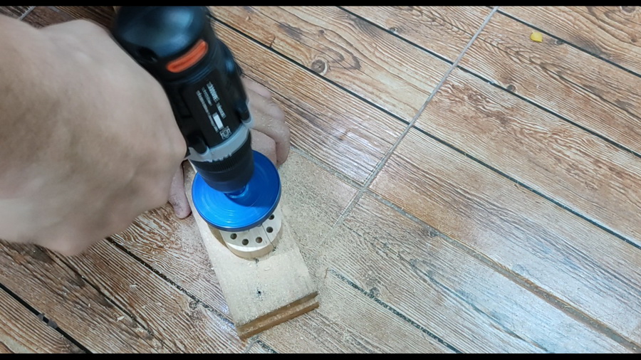 3. เมื่อเรียบแล้ว ผมใช้โฮลซอเจาะโดยเลือกขนาดของโฮลซอให้ใหญ่กว่าขั้วหลอดไฟซักหน่อย และตอนเจาะให้เจาะระหว่างรูที่หน้าไม้เต็ม ไม่งั้นถ้าสว่านลงร่องรูขนเเปรง เบี้ยวแน่นอนจ้า