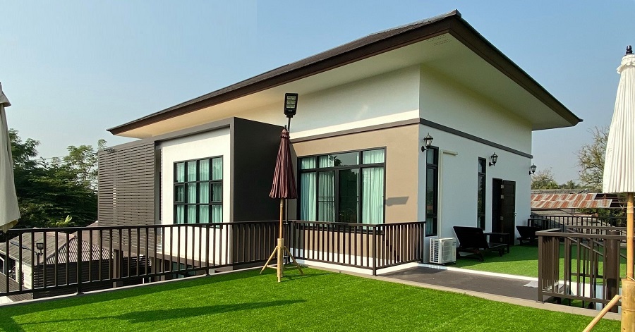 ผนังภายนอกเลือกใช้โทนสีขาวยืนพื้น เสริมความสวยงามด้วยโทนสีเทา และโทนสีน้ำตาลจากงานไม้ พื้นรอบบ้านปูด้วยหญ้าเทียม เพิ่มบรรยากาศที่สดชื่นและดูเป็นธรรมชาติ
