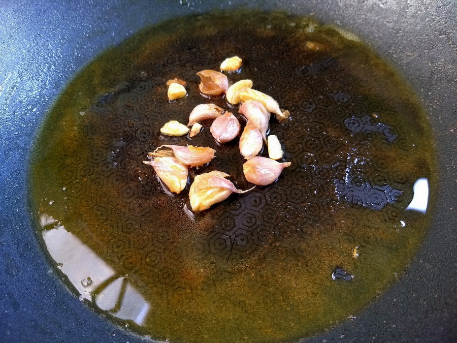 2. ตั้งกระทะไฟแรง ทุบกระเทียมให้พอบุบแล้วเอาลงผัดในเนยประมาณ 2 ช้อนโต๊ะจนเหลืองหอม