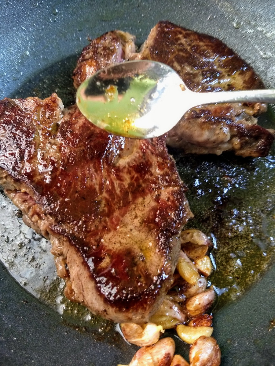3. เอาเนื้อลงจี่ในกระทะ ระหว่างนั้นก็ตักน้ำมันเนยราดลงไปบนเนื้อเรื่อย ๆ ถ้าชอบแบบ medium rare ก็จี่ประมาณด้านละ 2 นาทีก็พอ เนื้อได้ที่ก็เอาออกมาพักไว้ได้เลย