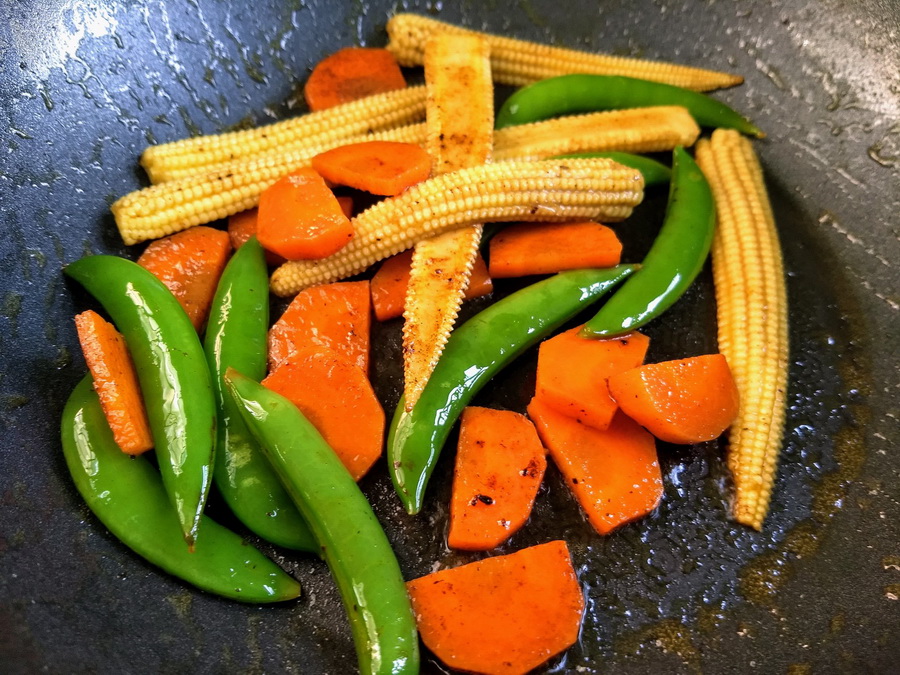 4. กระทะใบเดิมอย่าพึ่งล้าง ใส่ผักลงไปผัด รีบๆคลุกเคล้าให้เข้ากันสักนาทีสองนาทีก็เป็นอันเสร็จ เอาออกมาพักไว้ต่อเลย ผักพวกนี้ถ้าลวกในน้ำเกลือก่อนสักนาทีก่อนเอามาผัด จะได้ผักที่สีสดกรอบชุ่มกำลังดี
