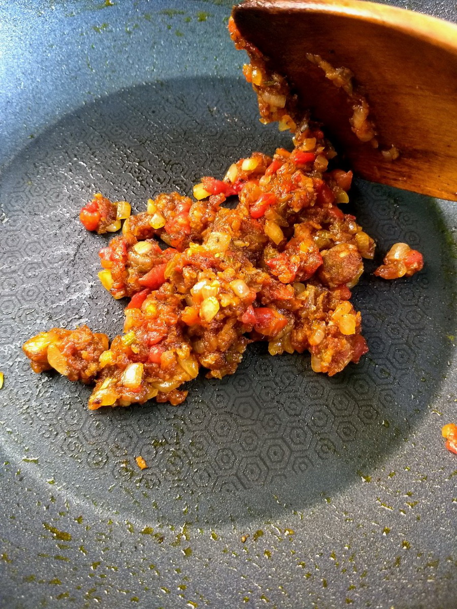 5. มาเตรียมซอสกันต่อเลย วันนี้จะทำเป็นบรานว์ซอสง่ายๆ เริ่มต้นแค่ตั้งกระทะไฟกลาง ใส่เนย 2 ก้อน ผัดกระเทียมสับ หอมใหญ่สับ ก้านขึ้นฉ่ายสับ แครอทสับ มะเขือเทศสับ อย่างละประมาณ 1 ช้อนโต๊ะ ถ้าชอบรสเผ็ดร้อนก็ใส่พริกไทยดำบดลงไปประมาณ 1 ช้อนชา ปรุงรสง่ายๆด้วยเกลือเล็กน้อยกับซอสมะเขือเทศประมาณ 1 ช้อนโต๊ะ