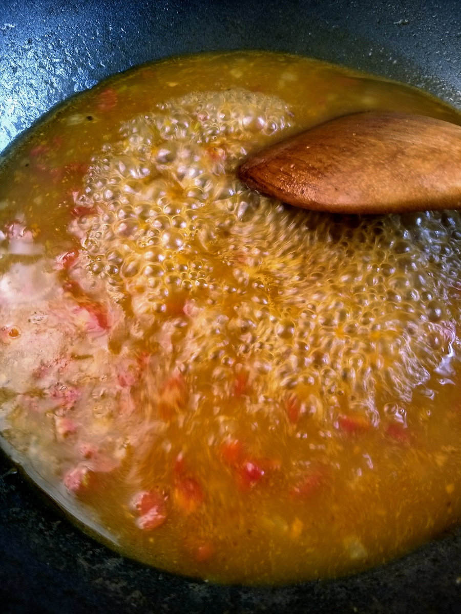 6. เติมน้ำซุปลงไปประมาณ 1 ถ้วยตวง เคี่ยวไปเรื่อยๆจนน้ำซอสเริ่มข้นเหนียว