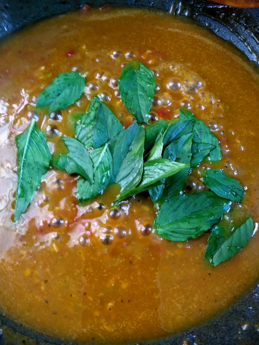 7. พอน้ำซอสข้นได้ที่ ก็ใส่ใบโหระพาแบบบ้านๆลงไปสักกำเล็กๆ แล้วคนให้เข้ากัน ผักทิ้งไว้ประมาณ 2-3 นาที